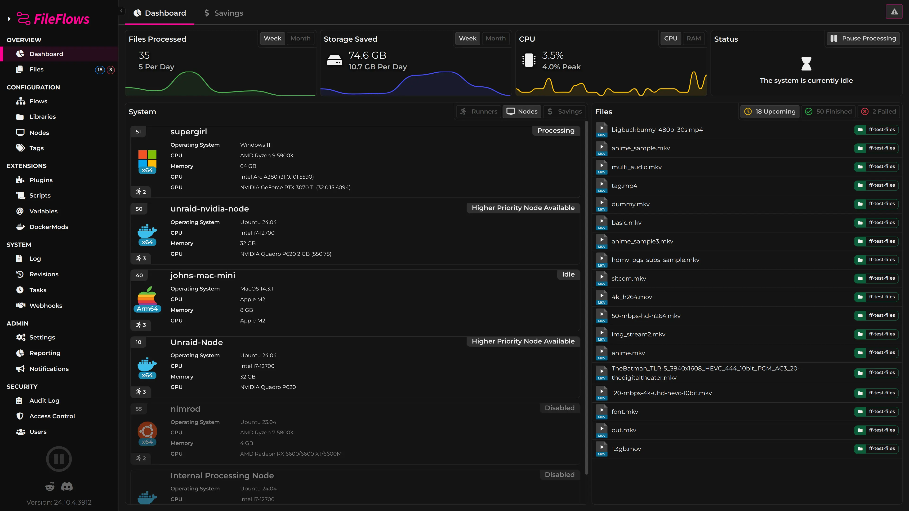 FileFlows lets you design, schedule, and run automated file processing pipelines with ease — from a single server to a distributed cluster. Perfect for self-hosted environments, home labs, and cloud deployments. Use the interface in multiple languages.