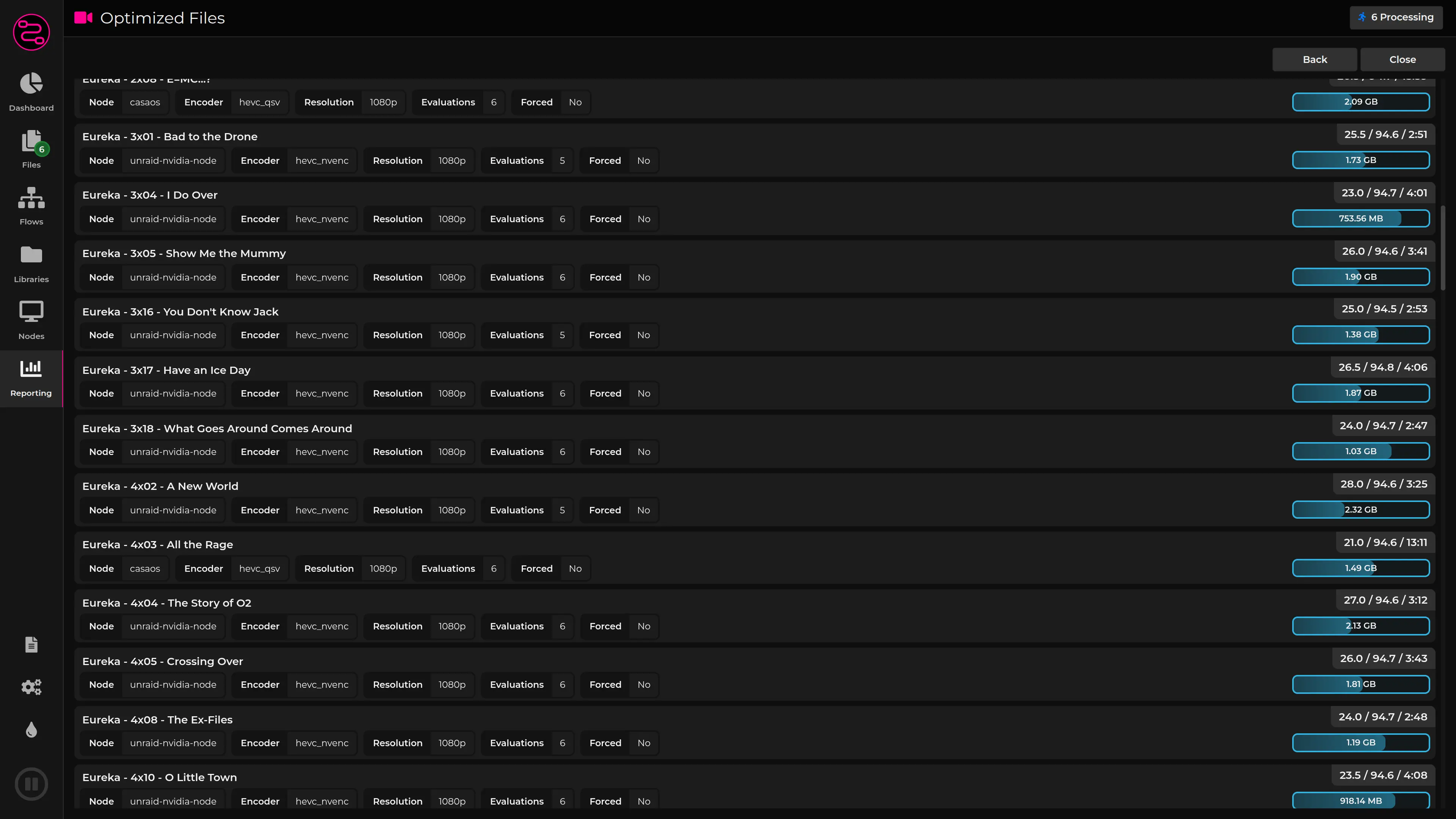The Optimized Files report provides detailed insights into all matching files that were optimized over a specified period. This report helps visualize how optimizations are performing across nodes and encoders, and what gains are being achieved.